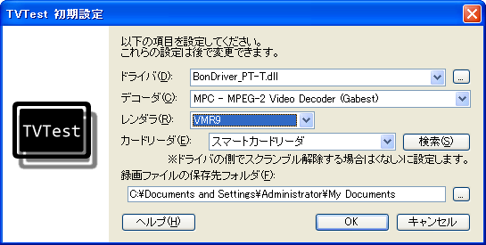 TVTest 初期設定ダイアログが表示されるので下記のように設定します。