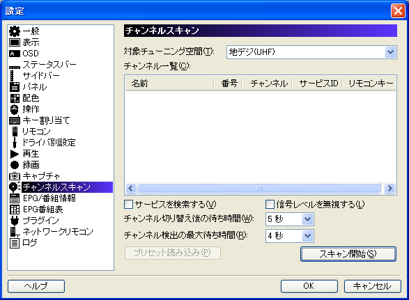 チャンネル一覧にスキャンしたチャンネルの一覧が表示されたら[OK]をクリックして設定ダイアログを終了します。