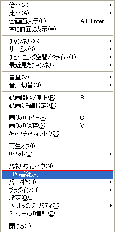 番組表はTVTestの画面上で右クリックをして[EGP番組表]を選択すると番組表が表示されます。